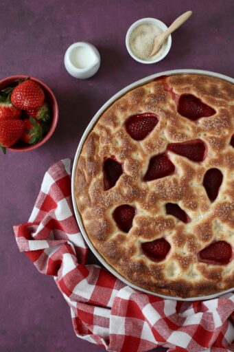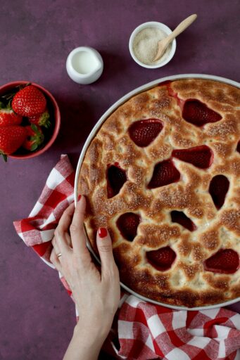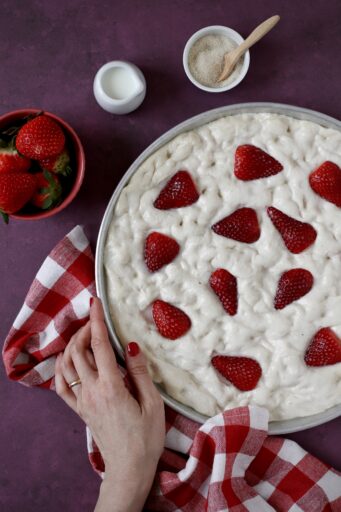 Ungo per bene una teglia da forno e ci trasferisco l’impasto una volta lievitato. Aiutandomi con le mani bagnate, schiaccio l’impasto con i polpastrelli per allargarlo su tutta la superficie della teglia. Taglio le fragole a metà, le adagio sulla focaccia e lascio riposare una mezz’ora. Verso l’acqua sopra la focaccia (non temete, sembra tanta, ma in cottura si asciugherà) e cospargo la superficie con dello zucchero.
