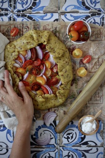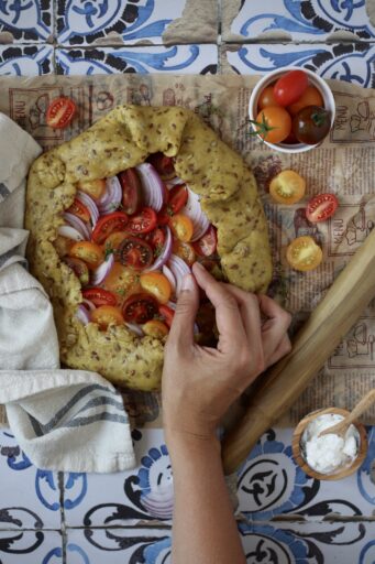 Preparo molto spesso la galette, perché la trovo un piatto versatile e facile da preparare. Può essere perfetta da servire come aperitivo o antipasto, durante una cena, ma anche comoda da portare nella schiscetta al lavoro o nello zaino, al posto del classico panino, quando si va in montagna o si fa una gita fuori porta. Sul blog ce ne sono già tantissime versioni: non mi stanco mai e ogni volta provo abbinamenti diversi. Visto che l’orto ci sta regalando tanti pomodorini, questa volta sono loro i protagonisti, insieme a della ricotta cremosa e alla cipolla rossa, che rende il tutto più saporito.