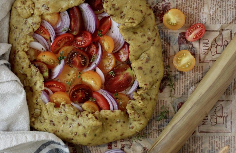 nel frullatore metto olio, vino, sale e frullo per un minuto. Aggiungo la farina e i semi e frullo, fino a che non si crea una palla di impasto omogeneo. Trasferisco l’impasto su una spianatoia leggermente infarinata e lo stendo, aiutandomi con il matterello, in modo da creare un disco circolare dello spessore di circa 3 millimetri. In una ciotola metto la ricotta, le erbe aromatiche tritate e mescolo bene. Taglio a metà i pomodorini e affetto la cipolla. Spalmo la ricotta sulla superficie della galette, lasciando liberi 4-5 centimetri di bordo. Aggiungo i pomodorini e la cipolla. Condisco un po’ di sale aromatico. Ripiego i bordi su se stessi. Inforno a 190° per circa 40 minuti. Servo tiepida.