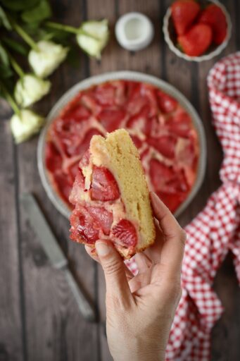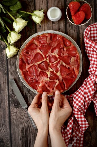 Verso delicatamente l’impasto sopra lo strato di fragole e inforno per circa 35–40 minuti. Durante la cottura controllo che la superficie non scurisca troppo: se necessario, copro la torta con un foglio di alluminio e continuo la cottura fino a quando è ben dorata e uno stuzzicadenti inserito al centro esce pulito.